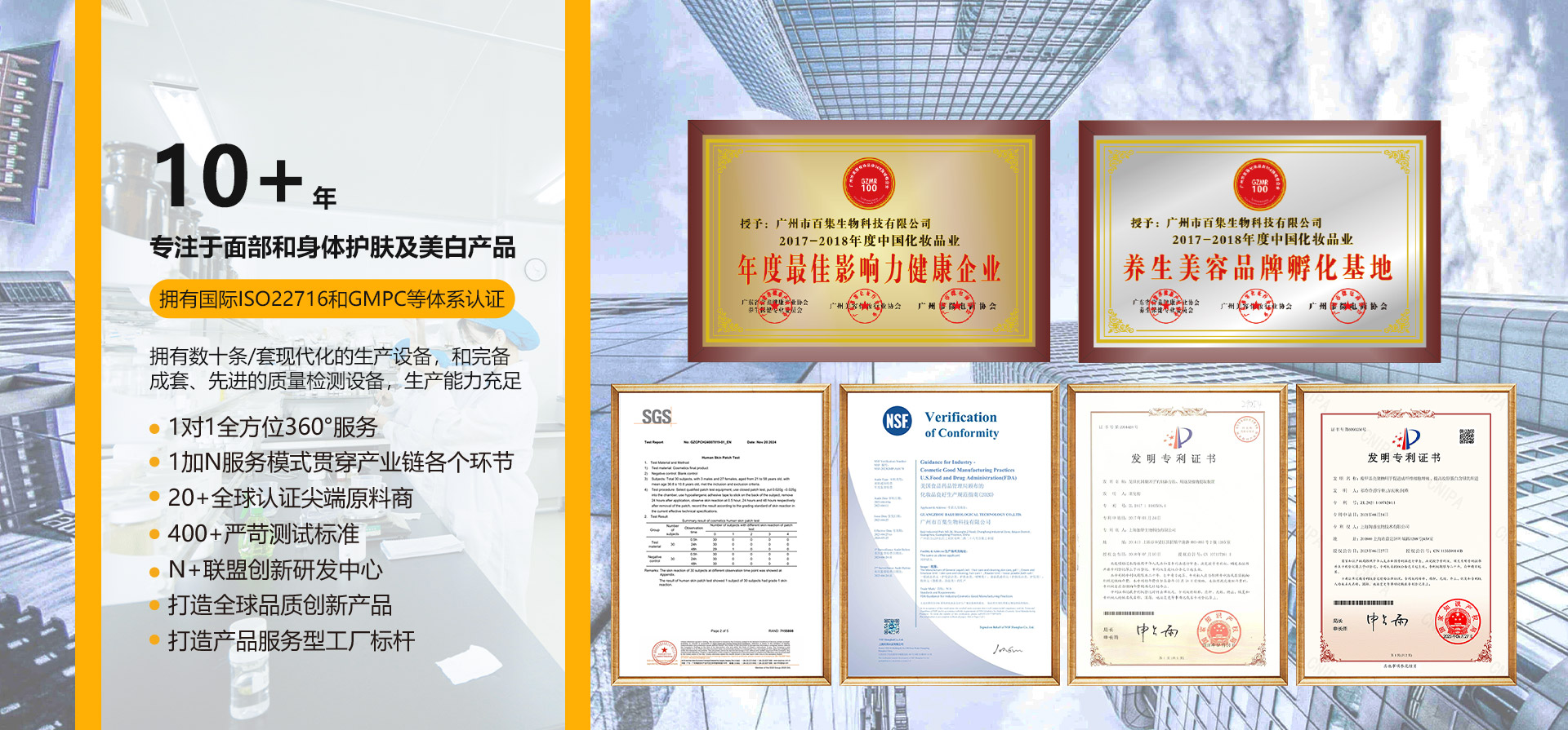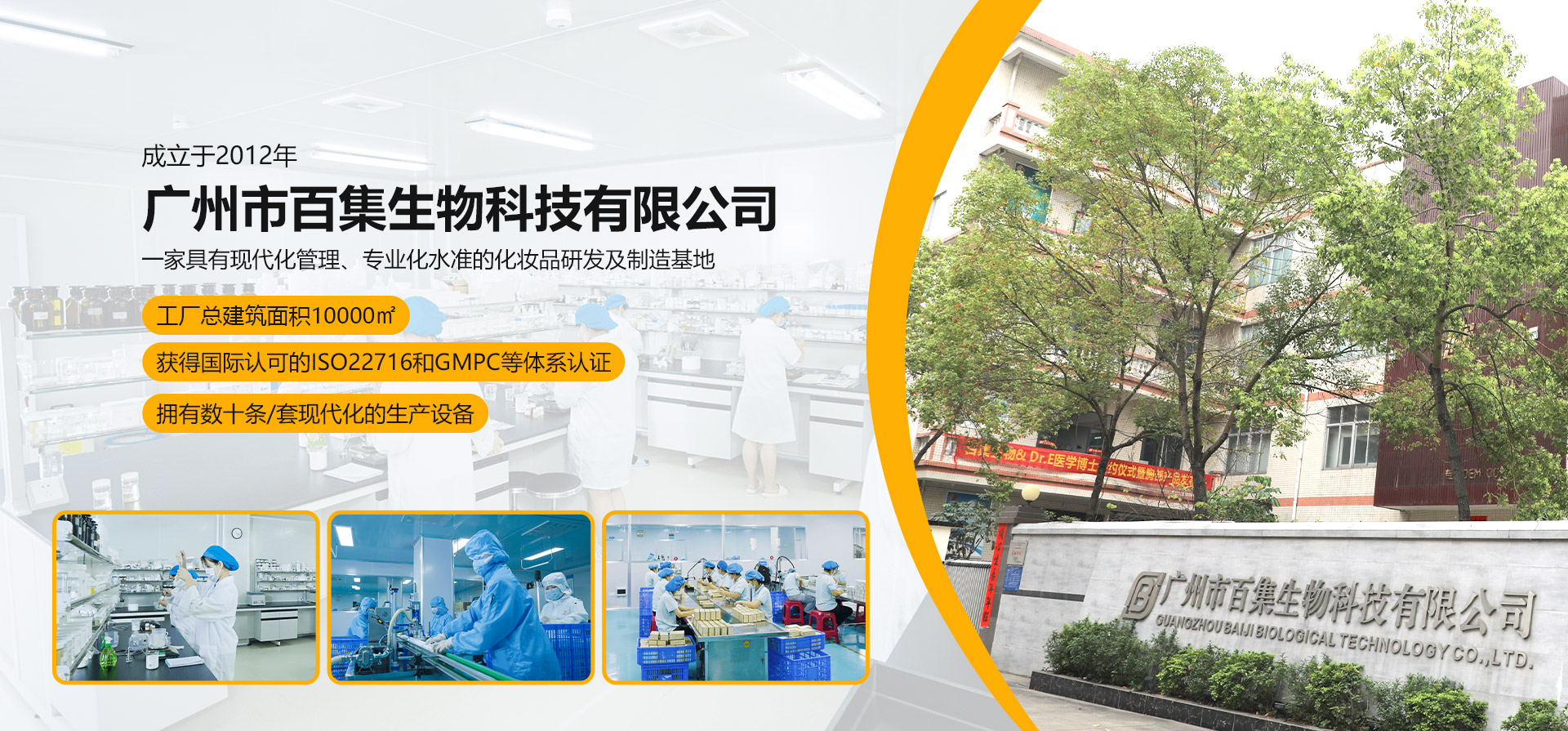 廣州市百集生物科技有限公司成立于2012年,坐落在亞洲化妝品硅谷的廣州市白云區,是一家具有現代化管理、專業化水準的化妝品研發及制造基地,為客戶提供專業的OEM/ODM一站式服務,涵蓋產品規劃、配方開發、包裝設計、功效測試、乳化、灌裝、包裝、倉儲物流等全方位服務。產品涵蓋各類化妝品水、乳、霜、膏、面膜、精華、BB霜、CC霜、素顏霜、精油及粉類等成品及半成品,涵蓋日化線及專業線配方。公司秉承“創新、共贏”的核心價值觀......